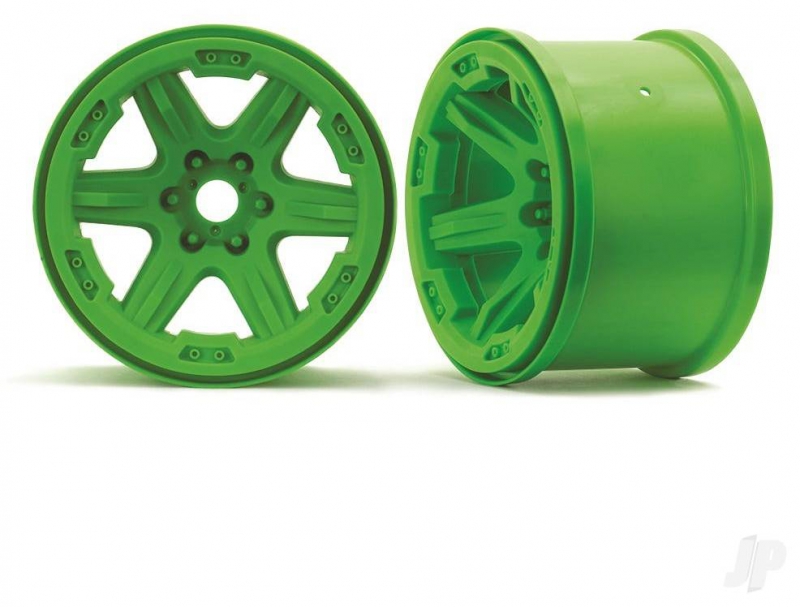 These tough 3.8" green 6-spoke wheels are built to take a pounding. Sold as a pair. Wheels require 17 mm splined hex.