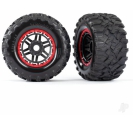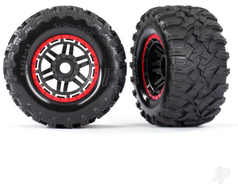 Rugged Maxx MT all-terrain Tyres features a unique tread pattern with multiple layers of biting edges for sure-footed traction on just about any surface. The heavy duty rubber compound is TSM-rated for high-speed applications and resists tearing on rough terrain. tyres come pre-mounted with foam inserts and glued to 2.8" dual-profile black Maxx wheels with a red beadlock-style ring. Fits 17 mm splined hex, front or rear.