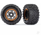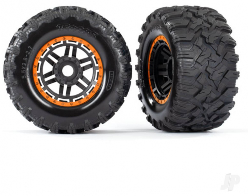 Rugged Maxx MT all-terrain Tyres features a unique tread pattern with multiple layers of biting edges for sure-footed traction on just about any surface. The heavy duty rubber compound is TSM-rated for high-speed applications and resists tearing on rough terrain. tyres come pre-mounted with foam inserts and glued to 2.8" dual-profile black Maxx wheels with a orange beadlock-style ring. Fits 17 mm splined hex, front or rear.