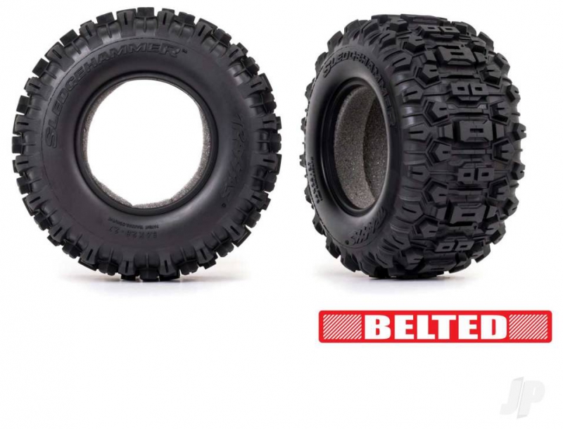 Belted Sledgehammer tyres deliver game-changing stability and control whether youre slinging mud or setting speed records. The wide, open-block tread design wont clog up with dirt or debris and the lightweight belting maintains the tyres shape for a larger contact patch, more grip, and responsive handling at any speed. The Sledgehammers increased diameter gives your Maxx a more powerful stance with even higher ground clearance.