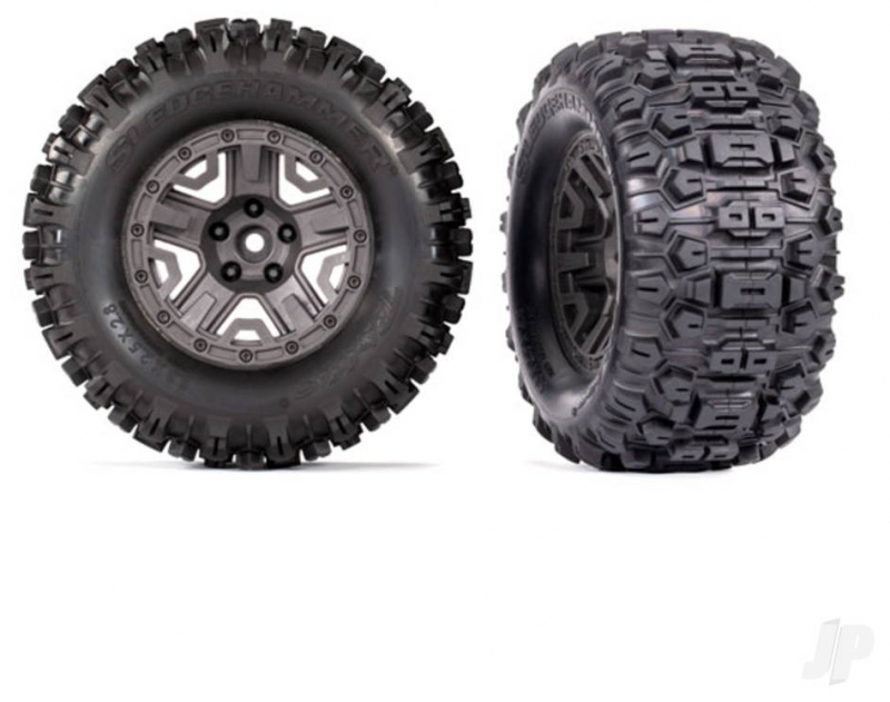 Ultra-rugged Sledgehammer tyres provides extreme traction and control for a variety of off-road terrain. The Sledgehammer's increased overall diameter provides additional ground clearance, while the open block tread design clears mud and debris for unmatched traction in loose surfaces. The tyres are TSM-rated for high-speed and come pre-mounted with foam inserts and glued to 2.8" charcoal gray wheels with a beadlock-style ring. Fits 12 mm hex, front or rear.