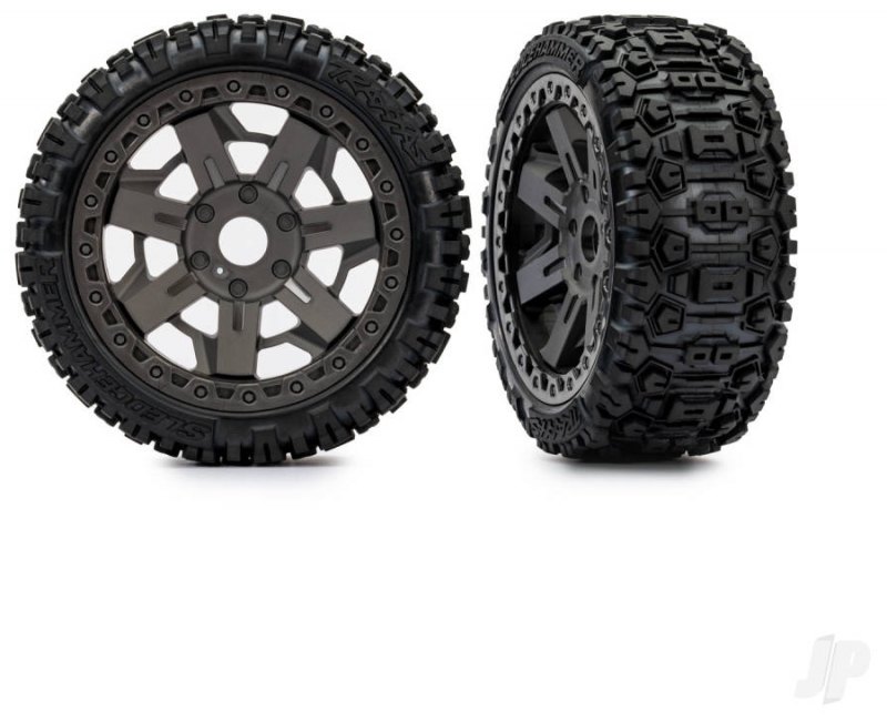Ultra-rugged Sledgehammer low-profile buggy tyres combine extreme traction game-changing stability and control. The Sledgehammer's open block tread design clears mud and debris for unmatched traction on loose surfaces. The tyres come mounted with foam inserts and glued to 3" gray buggy wheels with beadlock detail. Sold as a pair.