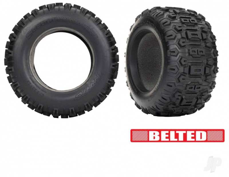 Belted Sledgehammer tyres deliver game-changing stability and control whether you're slinging mud or setting speed records. The wide, open-block tread design won't clog up with dirt or debris and the lightweight belting maintains the tyre's shape for a larger contact patch, more grip, and responsive handling at any speed. The Sledgehammer's increased diameter gives your Sledge a more powerful stance with more ground clearance. Fits 3.8" Sledge wheels and includes foam inserts.