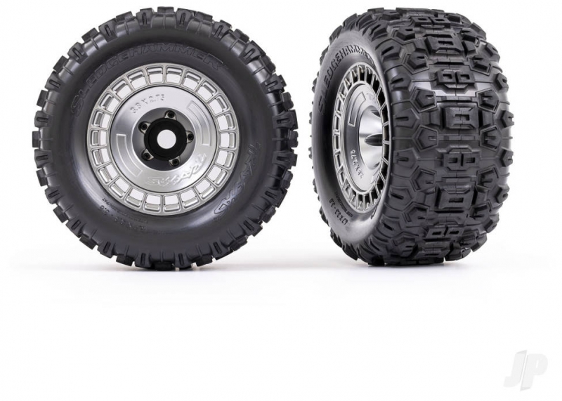 Ultra-rugged Sledgehammer Tyres provides extreme traction and control for a variety of off-road terrain. The Sledgehammer's open block tread design clears mud and debris for unmatched traction on loose surfaces. The Tyres come mounted with foam inserts and glued to 3.8" satin chrome modular wheels with satin chrome wheel covers. Sold as a pair. Includes 2.5x8 mm screws (10) and 4x12 mm screws (10). Requires 17 mm splined hex, fits front or rear.