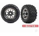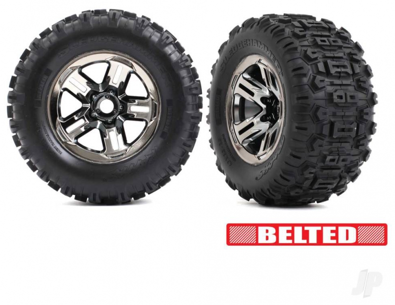 Belted Sledgehammer tyres deliver game-changing stability and control whether youre slinging mud or setting speed records. The wide, open-block tread design wont clog up with dirt or debris and the lightweight belting maintains the tyres shape for a larger contact patch, more grip, and responsive handling at any speed. Sledgehammer tyres come pre-mounted to 3.8" black chrome Sledge wheels with an ultra-tough glue bead for the most extreme high-speed off-road action.