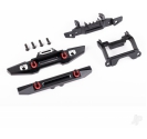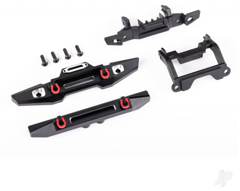 Take your TRX-4M Defenders scale realism to the next level with these front and rear aluminium bumpers. Milled from solid aluminium, these bumpers with red-anodised D-rings add style and strength to your ride. The bumpers feature a tough black anodised finish with machined edges for a high-tech look. The bumpers accommodate the Defenders standard bumper lights with mounting bosses on the rear bumper for a trailer hitch. The high clearance design keeps them away from obstacles so you wont get hung up on rocks.