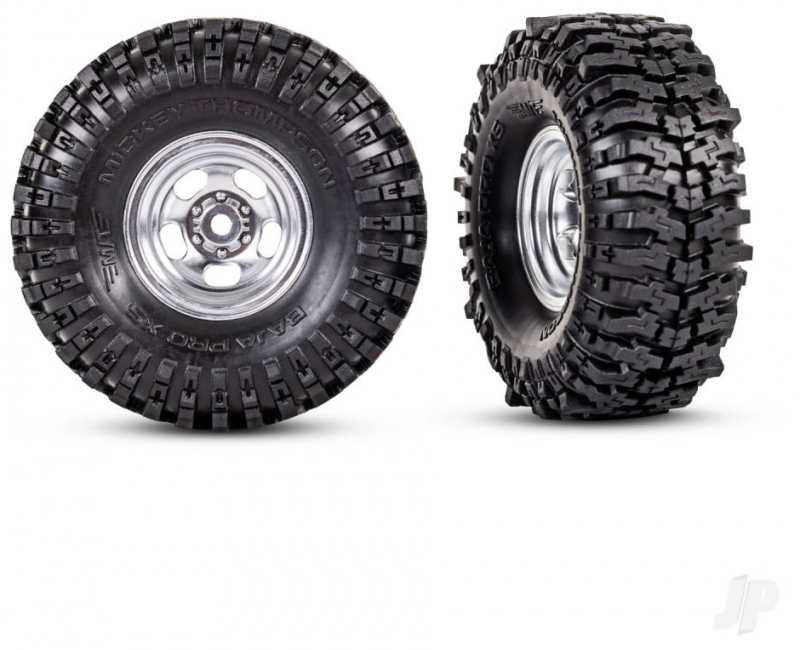Designed for the TRX-4M Long Arm Lift Kit, Mickey Thompson Baja Pro XS 2.4x1.0" tyres are taller than standard TRX-4M tyres for more ground clearance and an aggressive stance. tyres come pre-mounted to 1" satin chrome slotted mag wheels. For extra control on the trail, try 9874 firm or 9875 soft foam inserts.