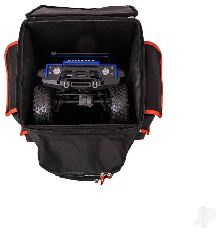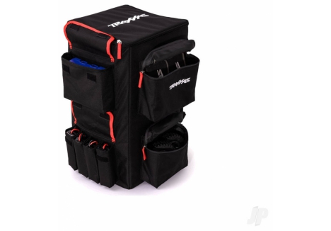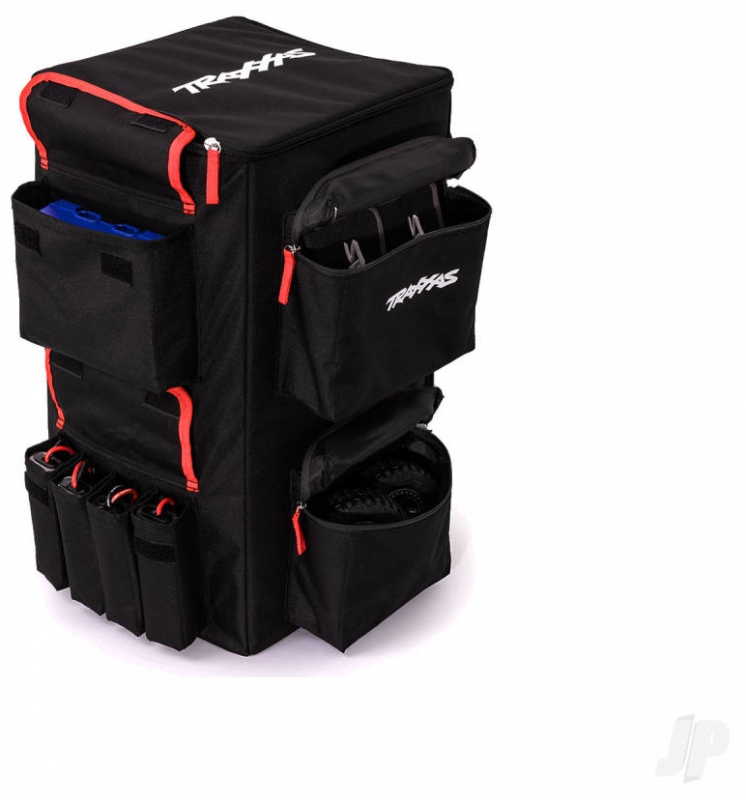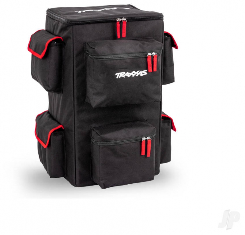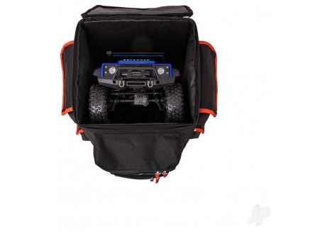 Based on the pro-quality bags our team uses in the field, the Traxxas backpack protects your gear and get you to your destination in style. The main compartment is perfect for TRX-4 and other 1:10 scale vehicles with semi-rigid front and rear plates for support and thick padded sidewalls. The backpack features two large zippered compartments on the front and four additional hooded pockets on the side. Protect your valuable investment and travel like a pro with the Traxxas RC backpack.