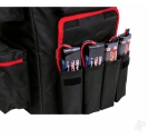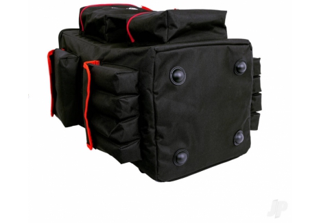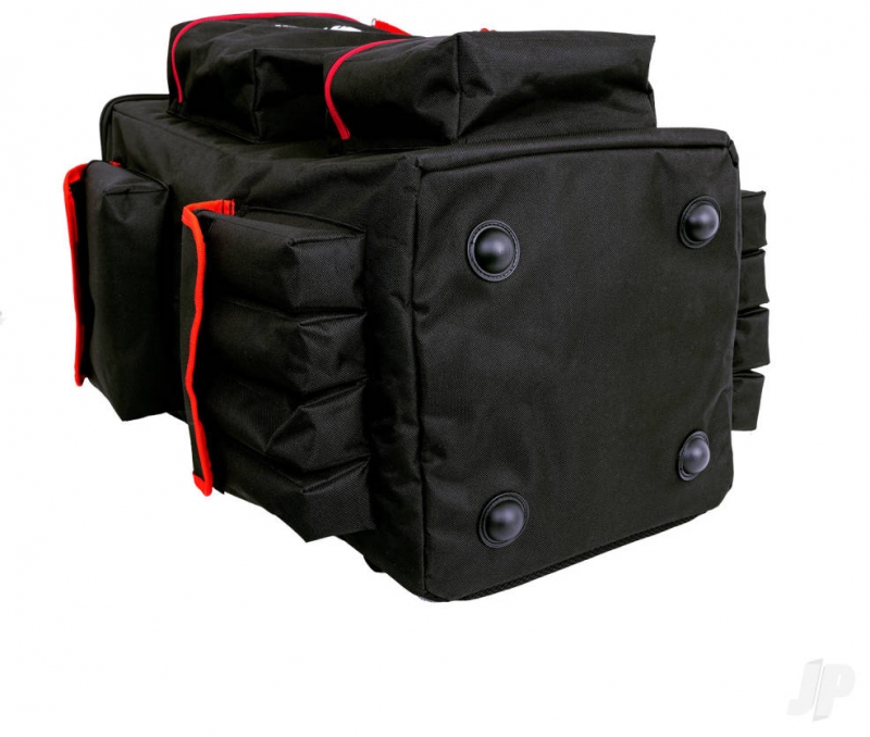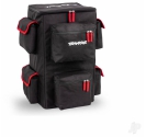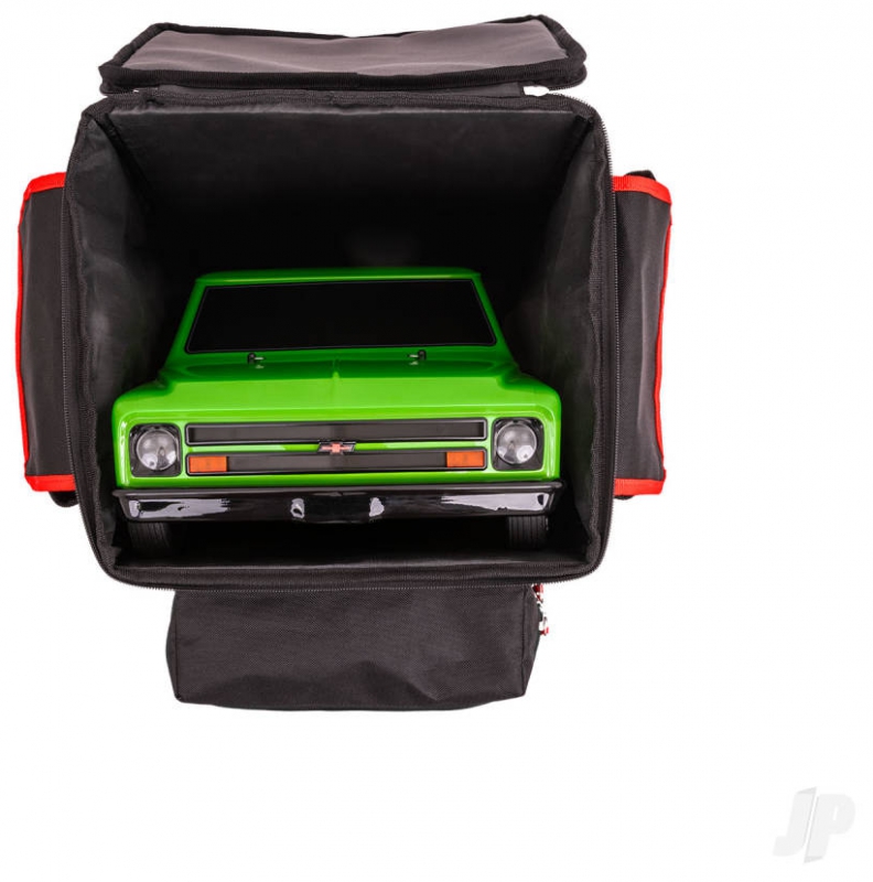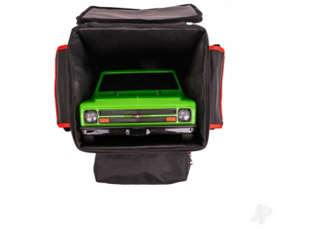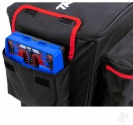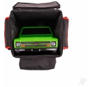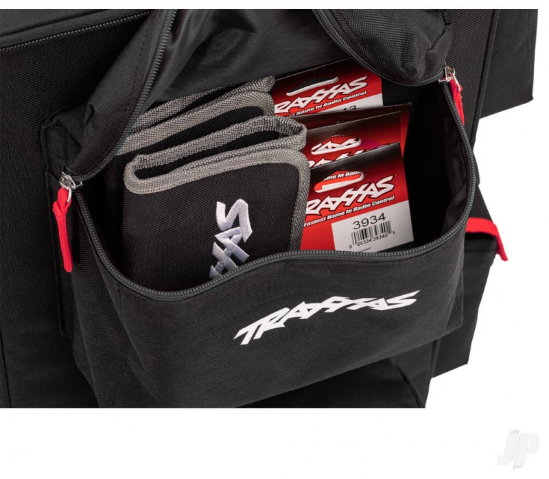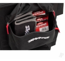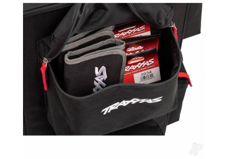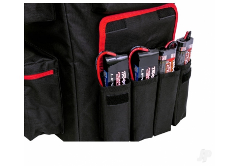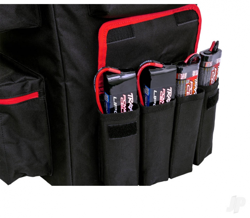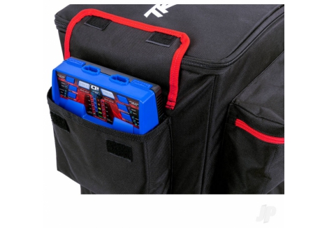 The large main compartment offers ample space for most 1:10 scale Traxxas vehicles with padded sidewalls for extra protection. Zippered front pockets are perfect for tools, spare parts and other gear. Bottom side pockets are subdivided into eight individual compartments to hold even the largest Power Cell 4s LiPo batteries and the padded top side pockets will accommodate the EZ-Peak Live Dual charger.