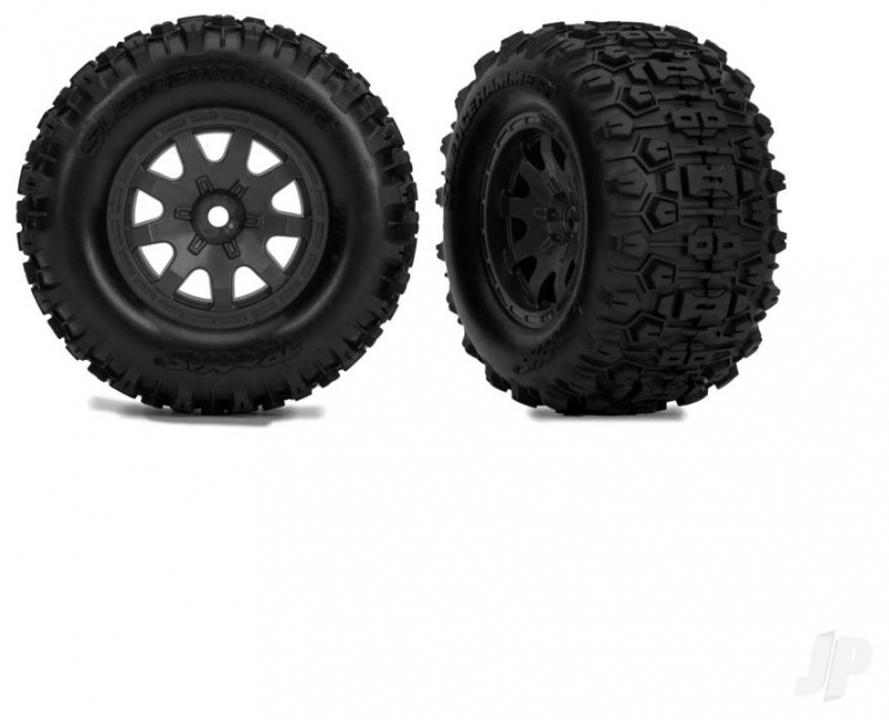 Traxxas Wheels & Tyres, Assembled (Black with Satin beadlock wheels, dual profile (2.1" outer, 2.6" inner), Sledgehammer tyres, foam inserts)) (front) (2) 020334043528
