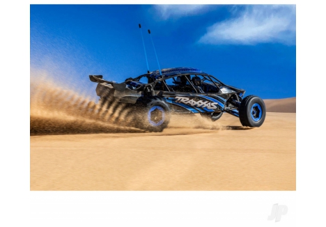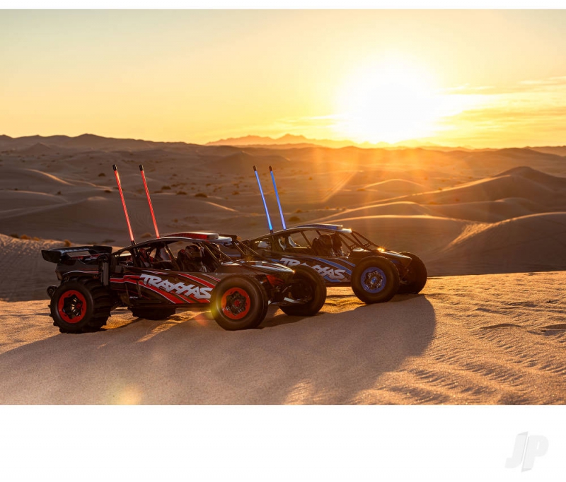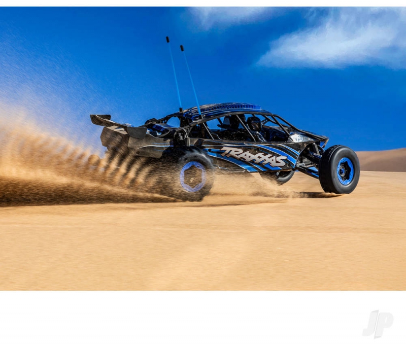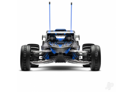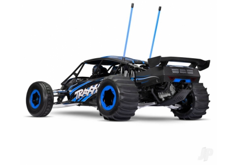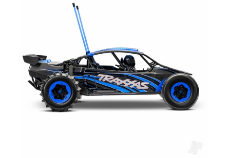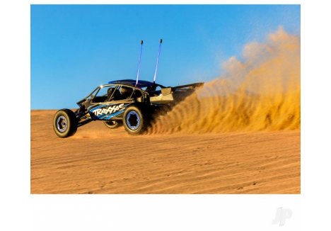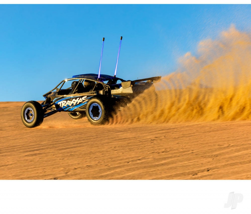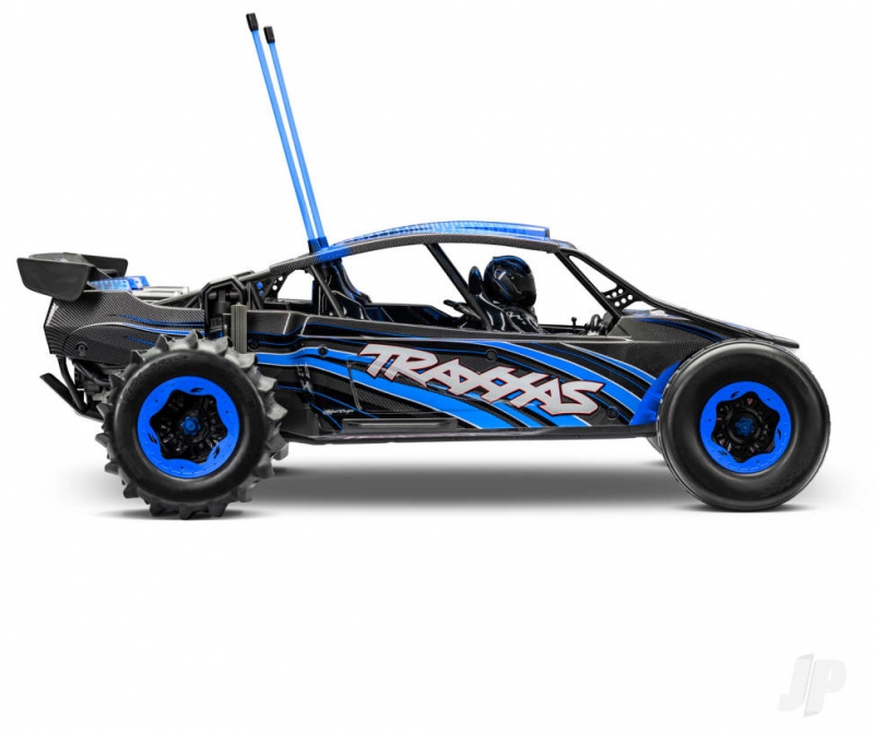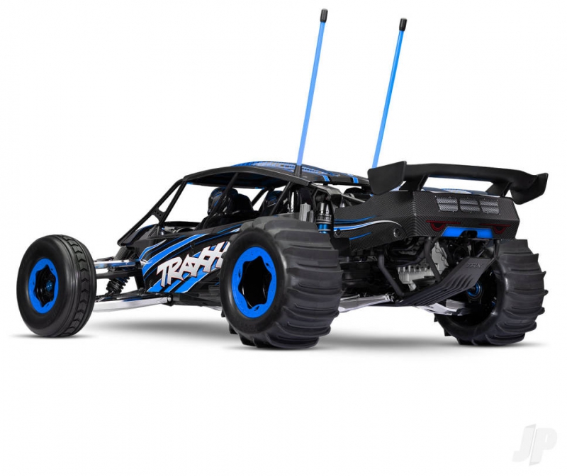 The Traxxas TRX109076-4-BLUE blue Funco buggy with replica clipless body and whip lights is a visual and mechanical tribute to full-size sand racing machines. Its clipless body features a full tube frame, detailed interior with driver figures, and a mock engine complete with licensed R2C air filters and Whipple supercharger. The whip lights add dynamic flair and visibility, while the beadlock wheels and suspension detailing reinforce its scale authenticity. This model is as much a showpiece as it is a high-performance RC vehicle.