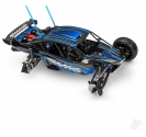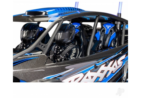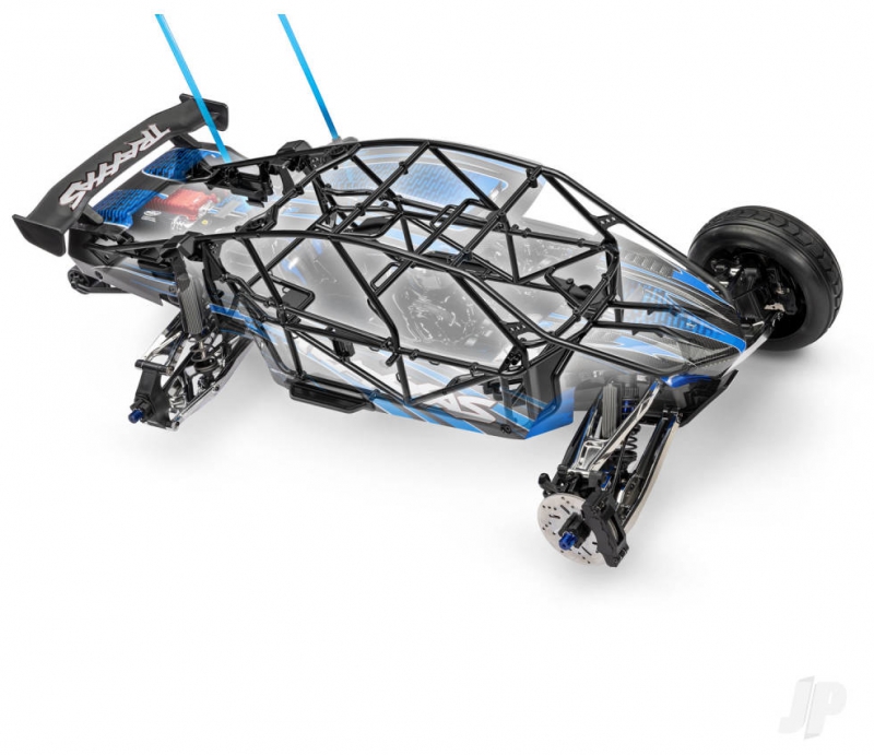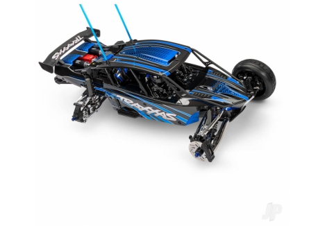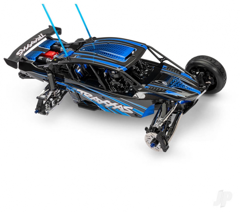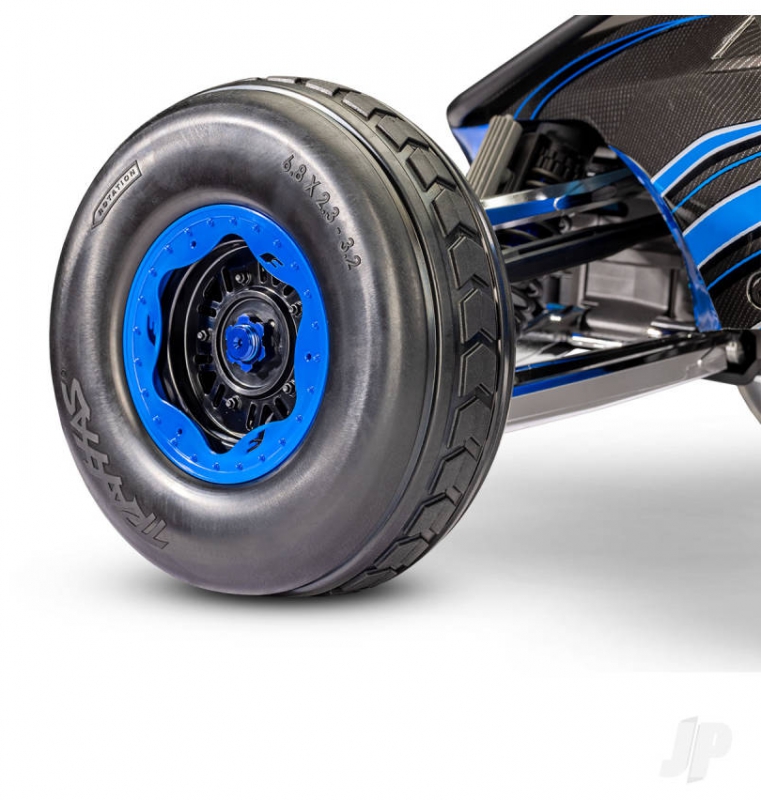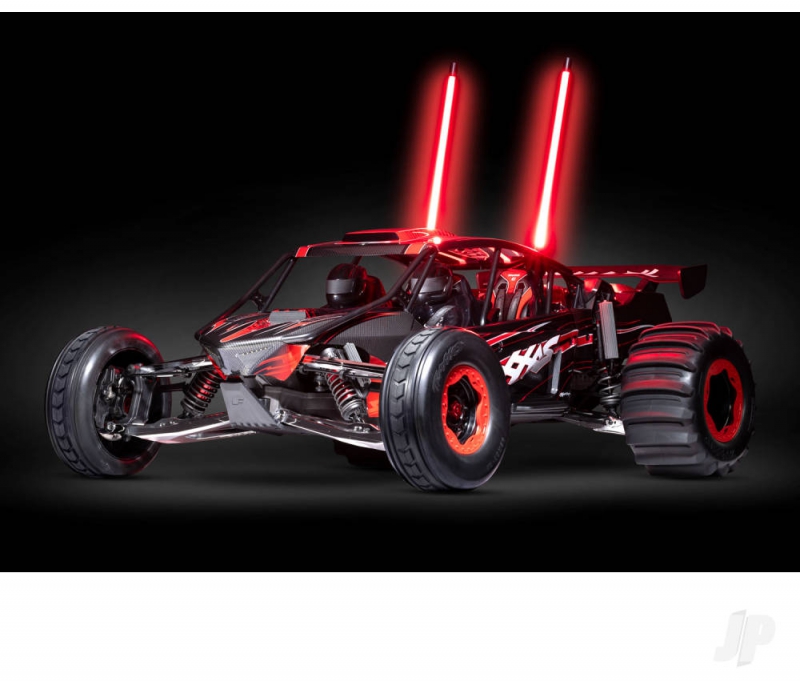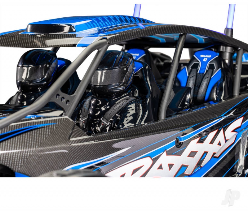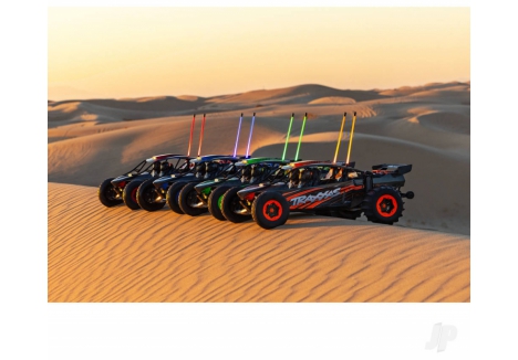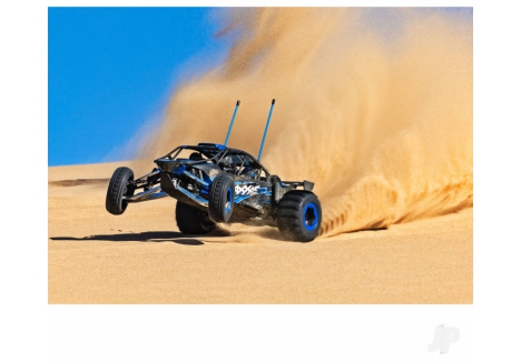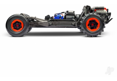The Traxxas TRX109076-4-BLUE blue Funco buggy with replica clipless body and whip lights is a visual and mechanical tribute to full-size sand racing machines. Its clipless body features a full tube frame, detailed interior with driver figures, and a mock engine complete with licensed R2C air filters and Whipple supercharger. The whip lights add dynamic flair and visibility, while the beadlock wheels and suspension detailing reinforce its scale authenticity. This model is as much a showpiece as it is a high-performance RC vehicle.