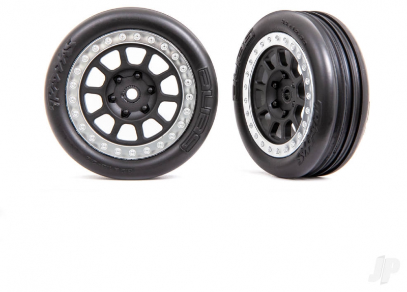 Traxxas Wheels & Tyres, Assembled (2.2in Graphite Grey, Satin Chrome beadlock wheels, Alias ribbed 2.2in Tyres) (2) (Bandit front, medium compound with foam inserts) 020334247162