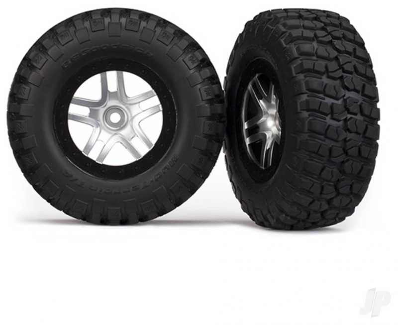 Traxxas Wheels & Tyres, assembled, glued (SCT Split-Spoke satin chrome, black beadlock style wheels, BFGoodrich Mud-Terrain T/A KM2 tyres, foam inserts) (2) (4WD f/r, 2WD rear) (TSM rated) 020334687302