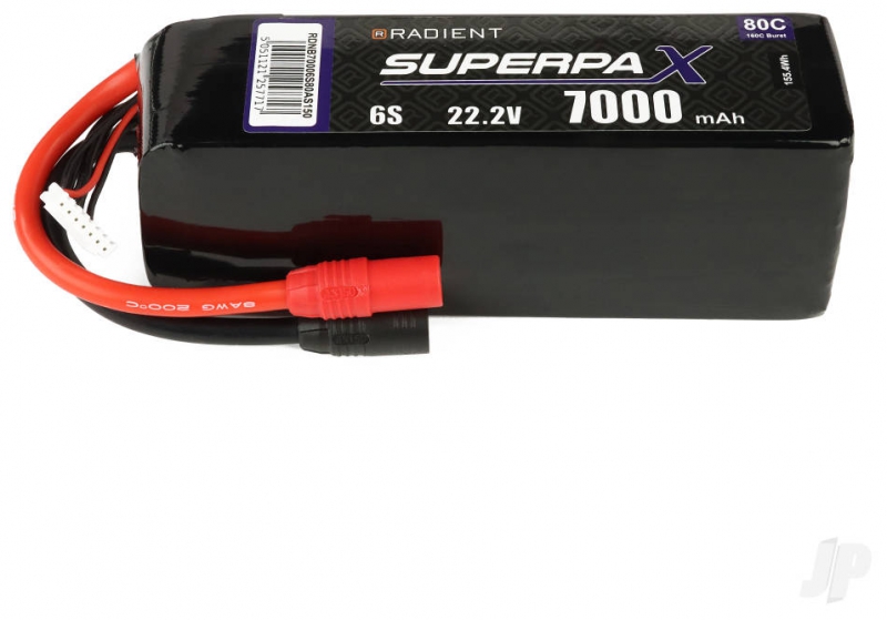 - Product Type – Radient RDNB70006S80AS150 6S LiPo battery with 7000mAh capacity, 22.2V output, and 80C discharge rate, Radient high-performance LiPo with AS150 connector, soft case, and 938g weight, Radient Superpax pack for 1/6–1/7 scale RC platforms with 163mm length and 58mm height, Radient with 33.09oz weight, 45mm width, and 6-cell configuration for extended battery trays, 6S LiPo battery for brushless ESC systems with AS150 plug, soft case housing, and CG-optimized dimensions