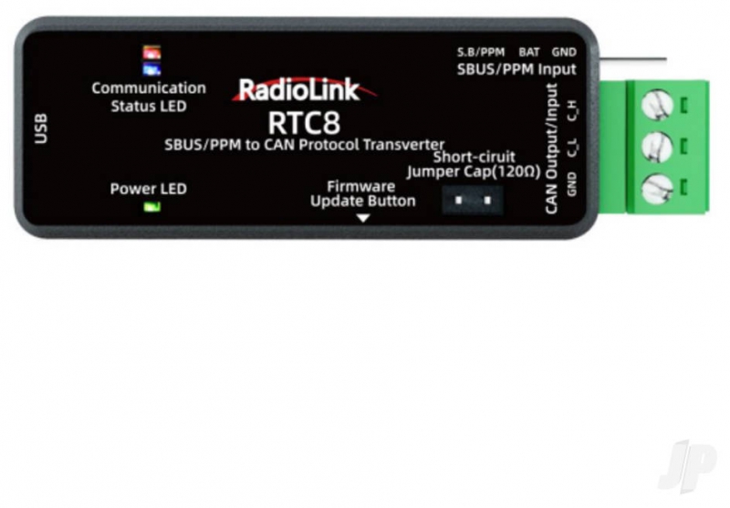 - Product Type – RadioLink RLKA001039 RTC8 encoder for SBUS/PPM to CAN protocol conversion with USB configuration support, RadioLink CAN encoder for autonomous systems with 5Kbps–1Mbps baud rate and 120Ω termination, RadioLink telemetry module for UAVs, robotics, and smart vehicles with dual signal input, RadioLink encoder with USB 2.0 interface and LED indicators, RadioLink SBUS/PPM to CAN encoder with real-time PC visualization and firmware upgradability