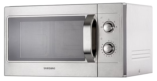 Designed for commercial environments, the Samsung CM1099A/XEU microwave with 26L capacity for multiple dishes supports a maximum cooking time of 35 minutes, making it ideal for batch cooking and large-scale food preparation. The mechanical control interface is straightforward and reliable, allowing kitchen staff to operate the microwave efficiently even during peak service hours. The swing door design adds to the ease of use, facilitating quick access to the cavity.