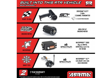 - Radio System: Spektrum SLT2 2-channel 2.4GHz transmitter – beginner-friendly with speed-limiting modes