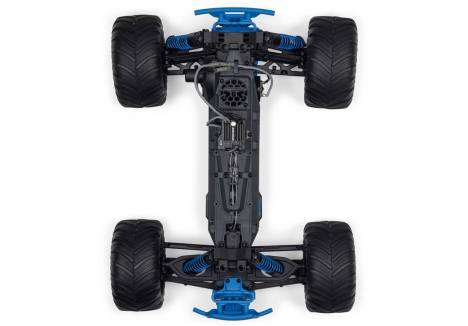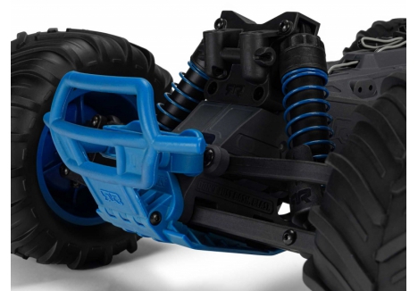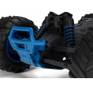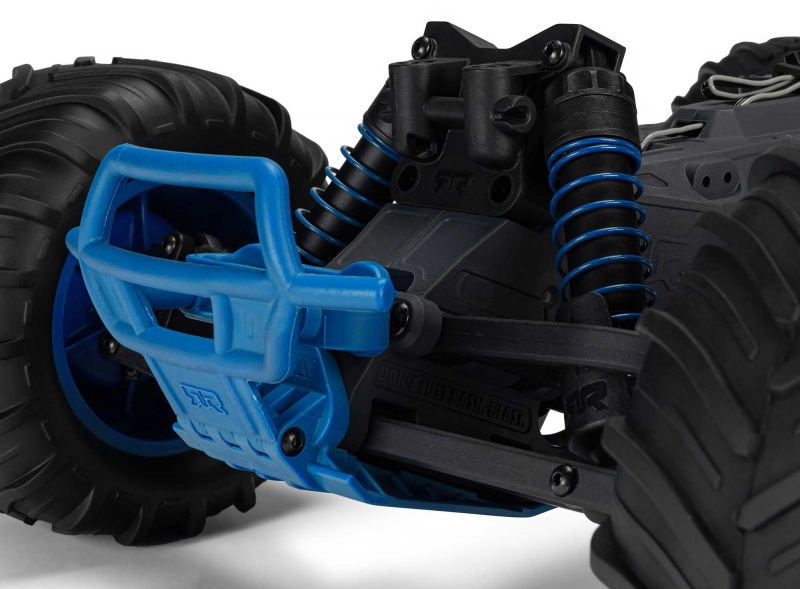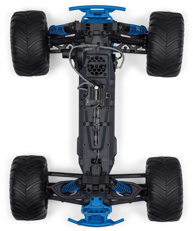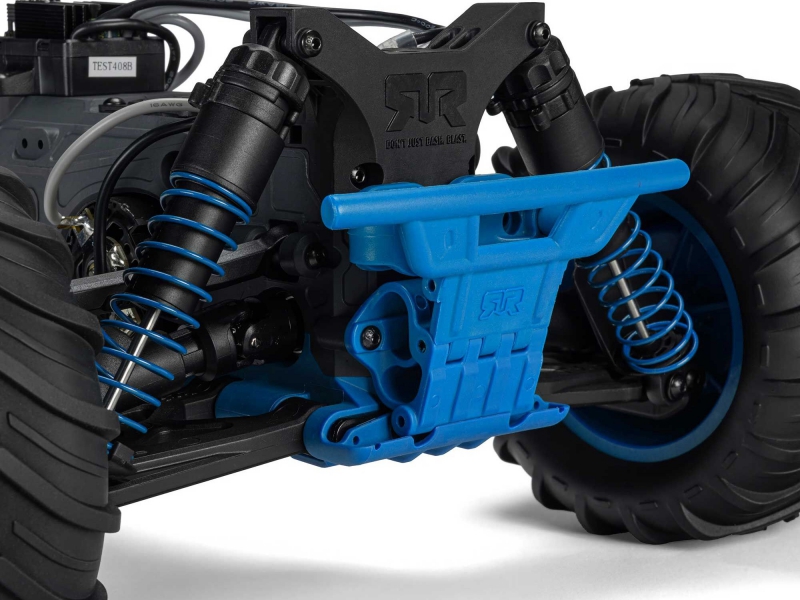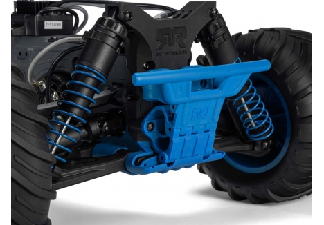 Designed for all-weather bashing, the ARRMA blue RC truck with waterproof electronics and coilover shocks includes a Spektrum 2-in-1 40A ESC and receiver unit, along with a high-torque Spektrum S660 waterproof steering servo. These components are sealed to resist moisture, allowing users to drive confidently through wet grass, puddles, and damp conditions. The waterproof system is housed within a composite chassis that resists dirt and debris, ensuring that the electronics remain protected during operation. For full waterproofing standards, users should refer to the instruction manual included in the box.