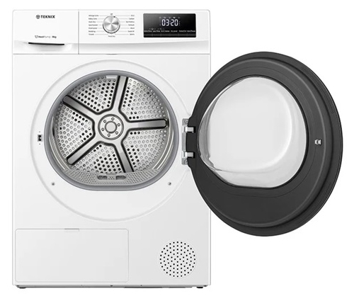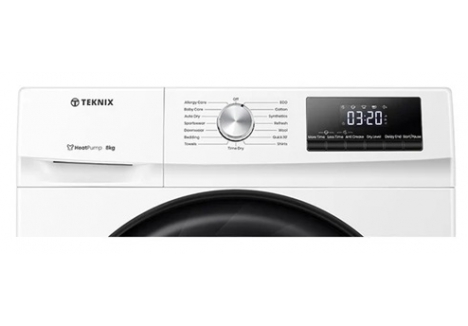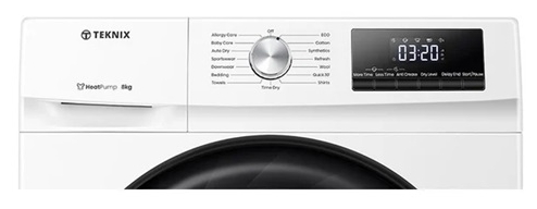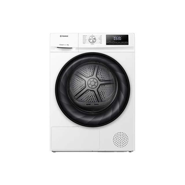 - Product Type: Teknix TKHP8HW 8kg heatpump tumble dryer with A++ rating and LED display, Teknix TKHP8HW white dryer with sensor drying and 30-minute quick dry, Teknix TKHP8HW freestanding tumble dryer with 15 programs and child lock, Teknix TKHP8HW with low-noise 64dBA operation and digital controls, Teknix 8kg heatpump dryer with energy-efficient motor and compact footprint, Teknix tumble dryer with 3-pin UK plug and front-load access