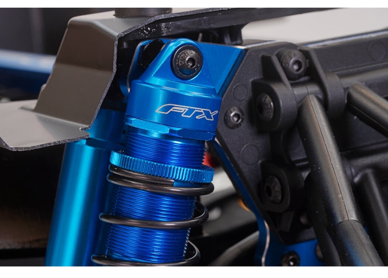 The FTX desert truck with aluminium chassis and dual shock absorbers features a heavy-duty aluminium main chassis designed with a low centre of gravity to reduce roll and improve handling. Reinforced with a front-to-rear top brace, the chassis resists flex and absorbs impact from jumps and rough terrain. Internal wheel well fenders and side guards shield the drivetrain from debris, while front and rear bumpers and skid plates protect against hard landings. This structural integrity ensures the FTX FTX5489BL brushless trophy truck remains stable and responsive even in the harshest conditions.
