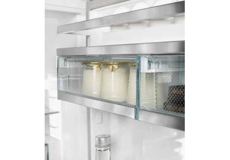 With a total usable capacity of 332 litres, the Liebherr SCNsdd fridge freezer combination offers ample space for fresh and frozen goods. The fridge section includes four safety glass shelves, a bottle rack, and a vegetable drawer on telescopic rails with humidity control. The freezer compartment features three transparent drawers and removable shelves for flexible storage. LED lighting in both compartments ensures full visibility, while the metal rear panel adds a premium touch.