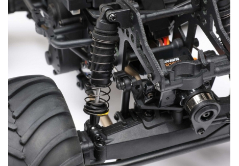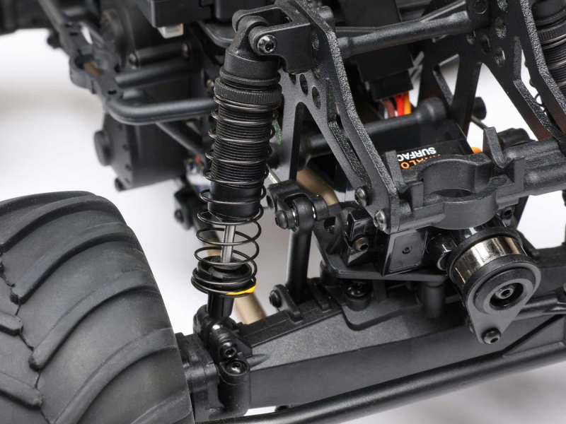 The suspension setup on the Losi Mini LMT Zombie 4x4 brushed RC truck with BKT tyres is designed for both realism and functionality. Threaded oil-filled shocks absorb impacts from jumps and rough terrain, while allowing for ride height adjustments and optional tuning with different spring rates and shock oils. Sway bars keep the suspension flat during cornering, improving lap times and maintaining control. This combination ensures that the Mini LMT Zombie performs reliably whether you're racing or freestyling.