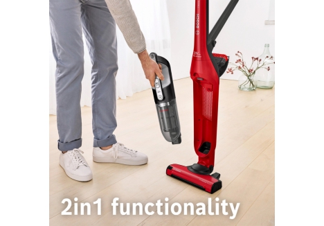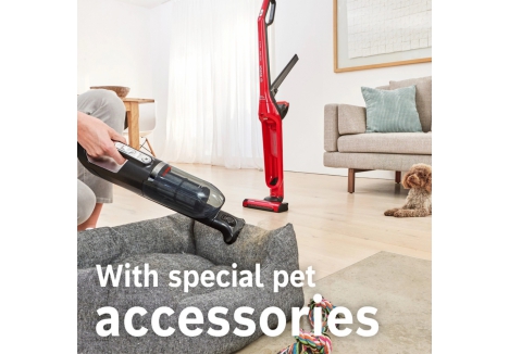 The Bosch BBH3ZOOGB cordless vacuum cleaner for pet hair – red is a high-performance cleaning solution designed for pet-friendly homes. Engineered with Bosch’s trusted Lithium-Ion Technology, this lightweight 2-in-1 stick vacuum offers powerful suction, extended runtime, and versatile usability. Whether you're tackling stubborn pet hair on carpets or reaching tight corners with the handheld unit, the Bosch BBH3ZOOGB Serie 4 ProAnimal 2-in-1 stick vacuum delivers consistent results across all surfaces. Its tornado red finish adds a bold touch to your cleaning arsenal, while the bagless design and RobustAir filtration system ensure hassle-free maintenance and cleaner air.