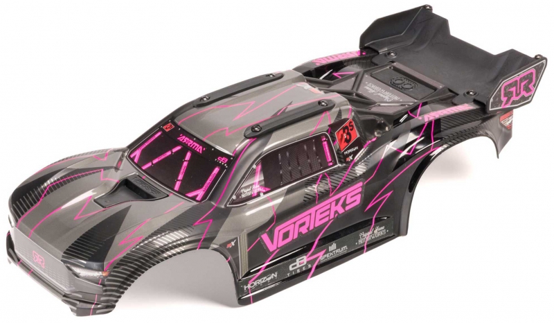 This VORTEKS Painted Decaled Trimmed Body in Pink and Black is the perfect replacement for the kit supplied item. High-quality molded bodyHead-turning paint schemePre-decaled with ARRMA vinyl stickers that adds stylish looksPre-trimmed and drilled for fast and easy installationFits 2WD VORTEKS models with hidden body mounting system
