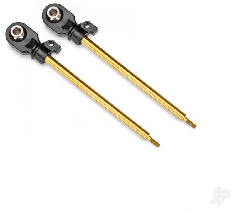 The titanium-nitride (TiN) coating on these 110 mm GT-Maxx shock shafts makes them harder and smoother for better resistance to scratching, smoother performance, and longer seal life. Shafts come assembled with rod ends and steel hollow balls. Sold as a pair.