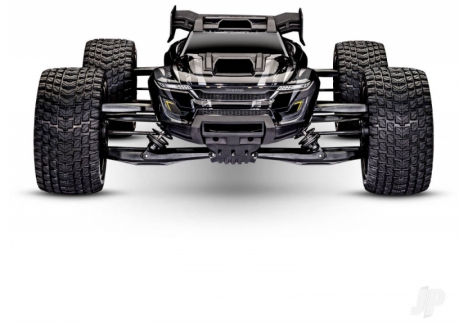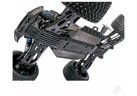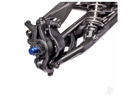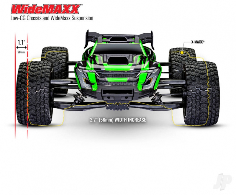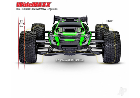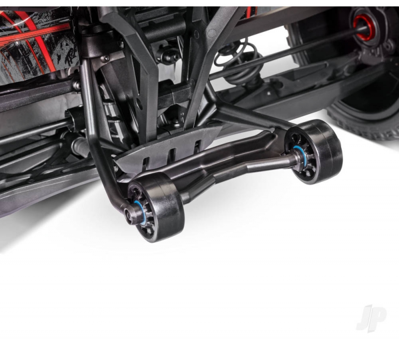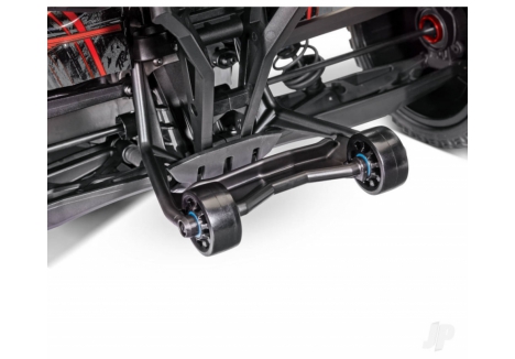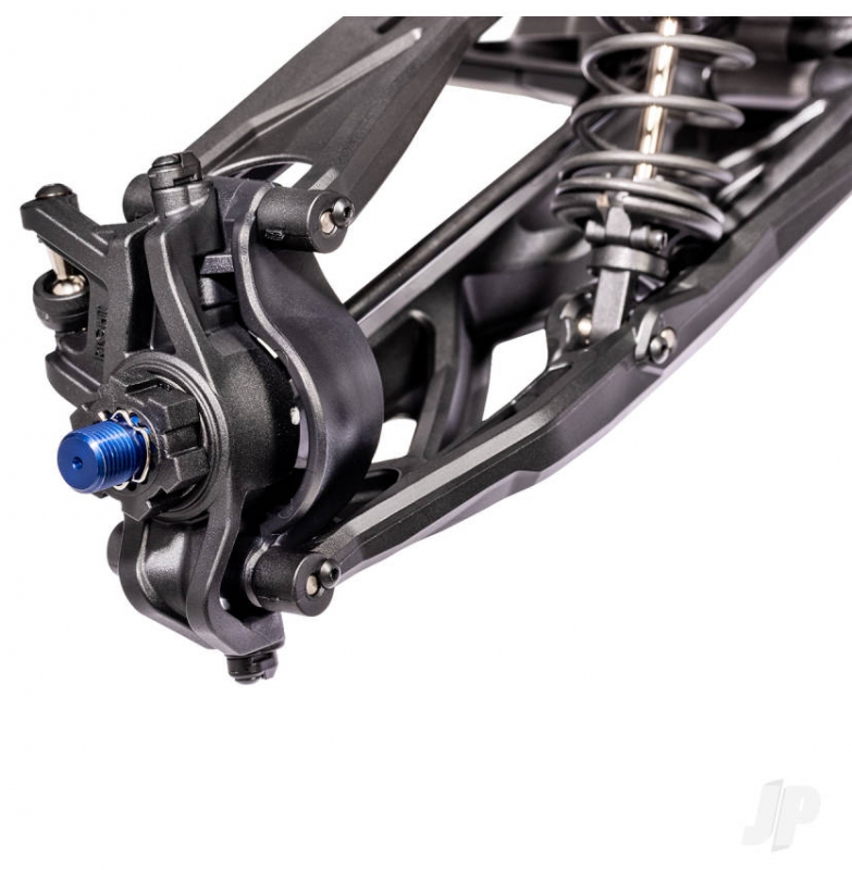 The Traxxas 1:6 scale 8S RC truck with Gravix tyres and WideMaxx suspension features extra-wide suspension arms made from cold-weather resistant material. Double-shear connections and 4 mm machined pivot balls ensure strength and precision. Fixed camber and toe links maintain geometry under stress, while oversized wheel bearings and reinforced axle carriers enhance durability. This suspension setup provides the stability needed for high-speed cornering and rough terrain control.