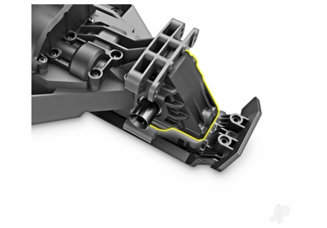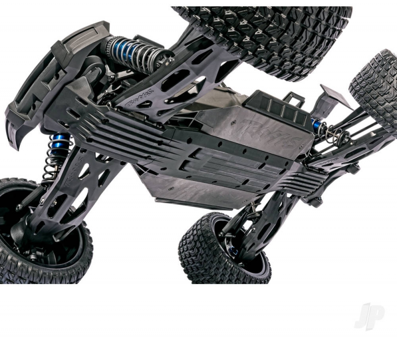 The Traxxas XRT brushless monster truck with low-CG chassis and telemetry uses a modular chassis with interlocking bulkheads and flat-bottom design. This lowers the center of gravity, improving cornering and reducing roll. Dual snap-lock battery compartments protect power packs from side impacts, while heavy-duty skid plates and buttressed shock towers absorb terrain forces. Integrated wire management keeps electronics secure and clean, supporting both performance and maintenance.