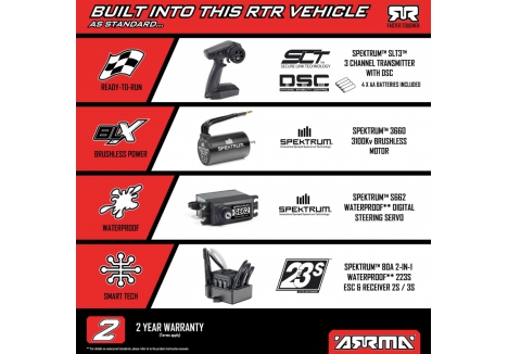 - Radio System: Spektrum SLT3 2.4GHz – 3-channel transmitter with throttle limiting switch