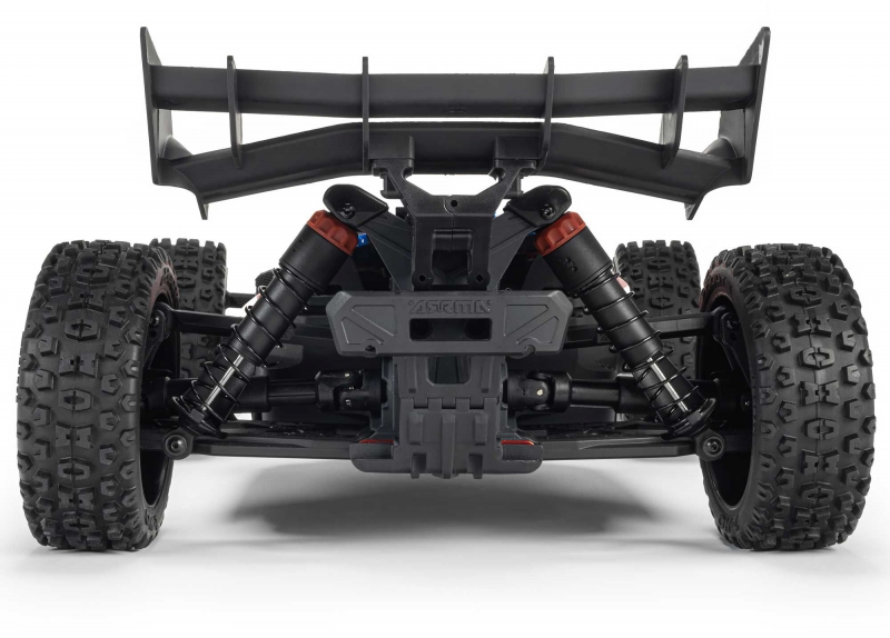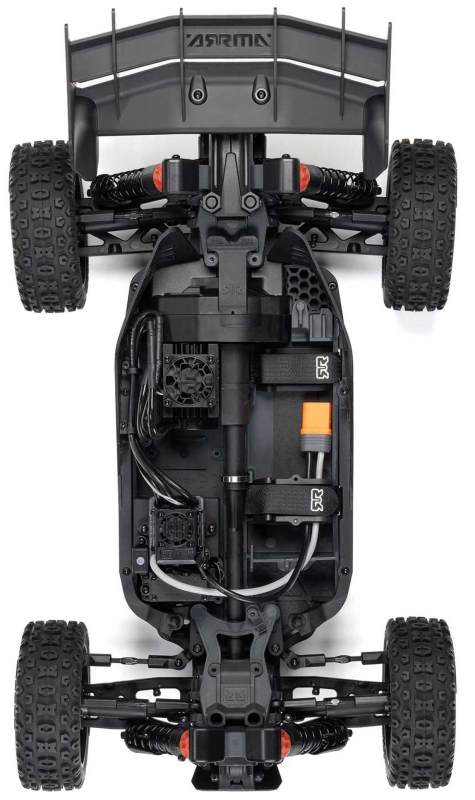 The ARRMA RC buggy with high-downforce wing and oil-filled shocks is equipped with a heavy-duty 4WD transmission system featuring all-metal gear differentials and durable composite slider driveshafts. These components are factory-installed and designed to handle the torque generated by the 3100Kv brushless motor. Power is distributed evenly to all four wheels, ensuring consistent traction and acceleration. The center driveshaft is reinforced for long-term reliability, and the gear mesh is easily accessible for maintenance. Combined with the composite chassis and impact-absorbing suspension, the drivetrain is built to withstand high-speed impacts and off-road abuse.