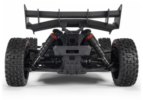 The suspension system of the ARRMA C-ARA4306V4T3 1/8 scale RC car includes independent all-terrain geometry supported by oil-filled coil-over shocks. These dampers are adjustable, allowing drivers to fine-tune ride height and rebound characteristics based on terrain. Whether navigating rocky trails or launching off dirt mounds, the suspension maintains wheel contact and absorbs impact efficiently. The high-downforce wing adds aerodynamic stability, especially during high-speed runs and cornering. This combination ensures that the TYPHON 223S BLX remains composed and responsive in all conditions.