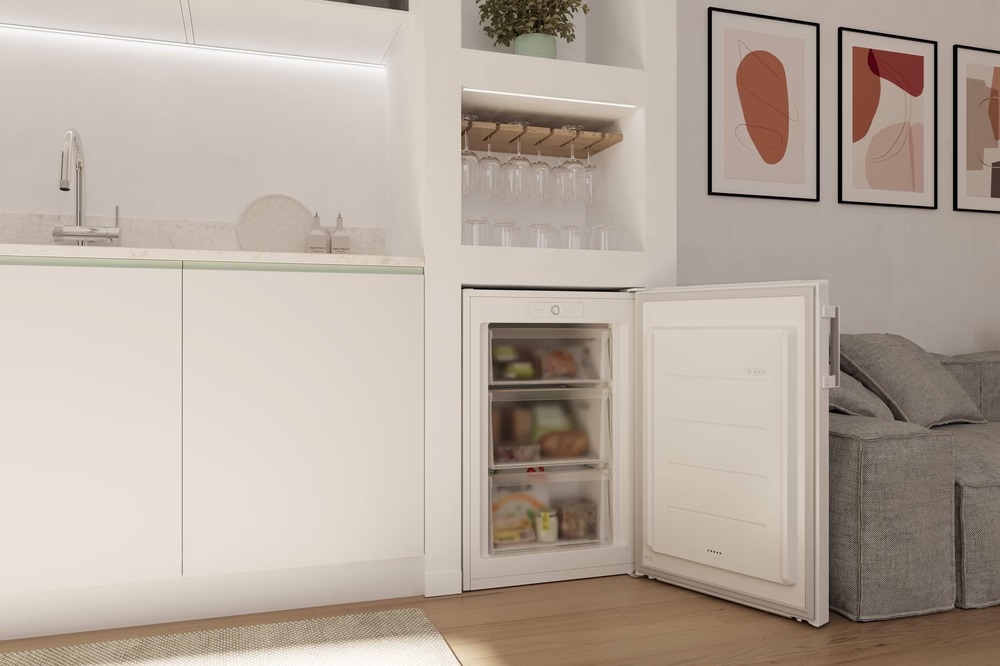 Yes. The Hoover HONUQ2L58EWHK compact upright freezer is designed for versatile installation. Its reversible door allows users to choose the hinge side that best suits their space, while the compact 54.5cm width and 86cm height make it ideal for undercounter placement. Whether positioned in a kitchen, garage, or basement, the freezer performs reliably—even in ambient temperatures as low as -15°C. Adjustable feet ensure stability on uneven surfaces, and the clean white finish integrates seamlessly into a variety of interior styles.
