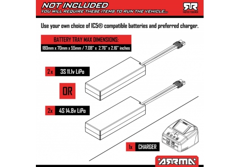 High-quality, factory-installed Spektrum electronics are ready for your choice of 6S or 8S LiPo power. The IC5 connector-equipped Firma 160A Smart V2 ESC is paired with a Firma 1450Kv Brushless Motor with ARRMA heatsink and dual cooling fans. Like the powerful, metal gear Spektrum S665 Digital Steering Servo, the motor and ESC are waterproof for worry-free bashing in any conditions.