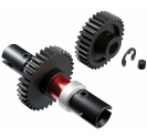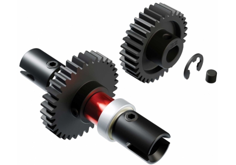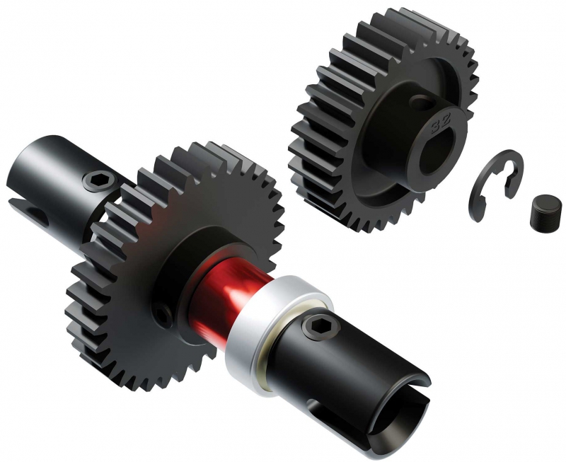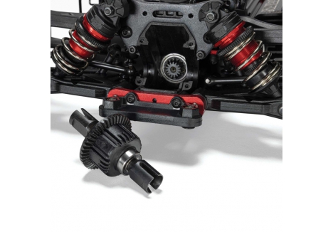 The 34T Mod 1.0 spool combines with a bearing-supporting rear center driveshaft to reduce drivetrain vibration. Stiff front springs and sway bar improve high-speed handling, and a wide rear track increases stability.