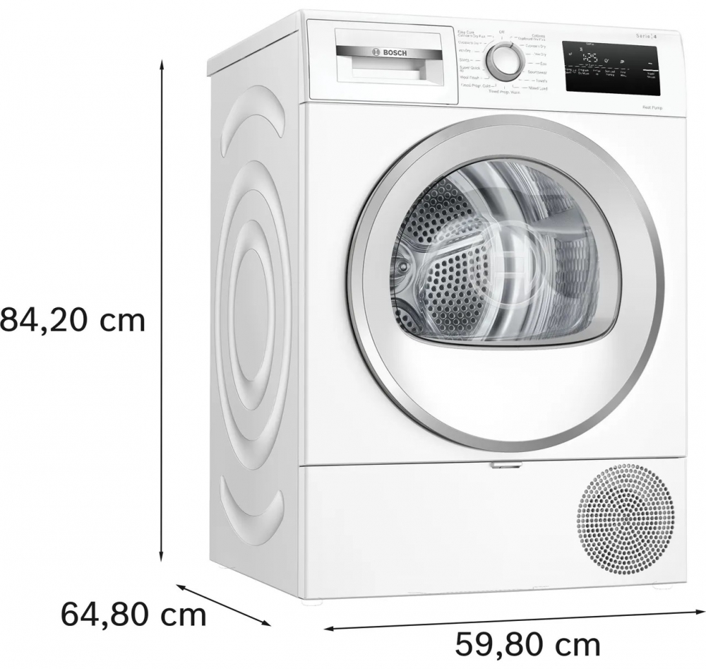 Absolutely. The affordable Bosch heat pump dryer with textile care drum and delay start is designed for freestanding installation and fits comfortably into most laundry rooms. With a depth of 64.8cm including the door, the dryer offers a compact footprint without compromising on capacity. The slide-under installation option allows for flexible placement under countertops, while the right-hand door hinge and pull-open latch provide easy access. The metal door catch and silver-white finish add a touch of durability and style to the appliance’s exterior.