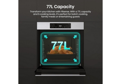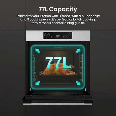 With a capacity of 77 litres, the Hisense BI622AXPGUK provides ample room to prepare large meals. Whether it’s roasting a full Sunday dinner, batch baking for the week ahead, or grilling quick snacks, this multifunctional oven can handle it all. The generous interior space supports multiple shelf positions, giving you flexibility to cook different dishes at the same time while maintaining consistent results thanks to its Even Bake technology.