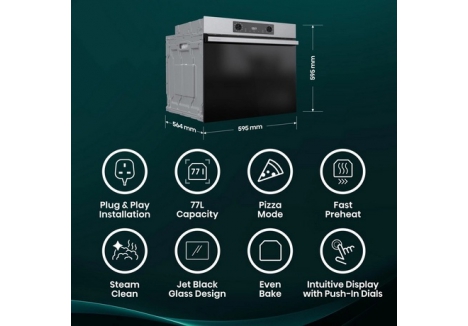 Yes. With dimensions of 595 x 595 x 564 mm (H x W x D), the Hisense BI622AXPGUK fits into standard built-in niches, making it a flexible option for most modern kitchens. At 26.4 kg, it is light enough for straightforward installation, and thanks to its plug-in design, it does not require complicated wiring.