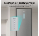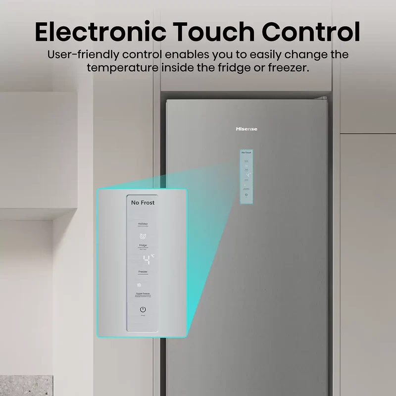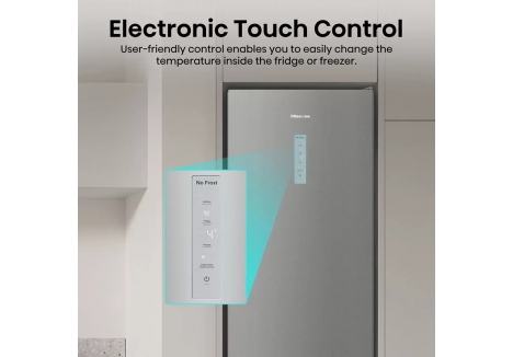 Hisense RM469N4ACDUK fridge freezer LED display affordable captures straightforward usability with on-door electronic controls and clear feedback via SensoTech Switch. Automatic defrost modes in both compartments reduce routine maintenance, Eco Mode suits periods when rapid chilling is unnecessary, and sound plus blue-light alerts prompt quick action if a door remains open or temperature rises unexpectedly.