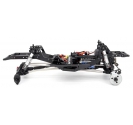 Chassis is engineered for strength and stability: a 6° flat skid plate, low-mounted electronics and battery bias forward help manage center of gravity. Molded components and adjustability in bumpers and body mounts provide flexibility.