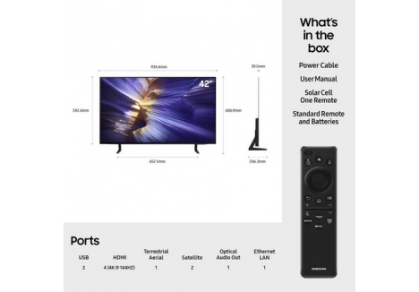 • Product Type: Samsung QE42S90FAEXXU TV, OLED HDR+ brightness & clarity, Motion Xcelerator 144Hz gaming, SolarCell Remote & LaserSlim design