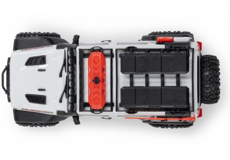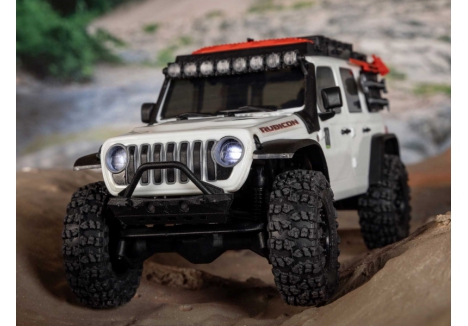 Surrounding that trail-ready engineering is a detailed ABS hard body that delivers amazing scale realism for its compact size. An authentic recreation of the full-size, 4-door Unlimited truck, the SCX30 Jeep Wrangler JLU body is complemented by front and rear LEDs and officially licensed Yokohama Geolandar X-MT tyres on Black Rhino Atlas wheels. The soft compound tyres with foam inserts provide all the traction needed for outdoor action on rocks and dirt or for crawling across a desktop, table, or cluttered floor. Turn any space into your personal Rubicon trail!