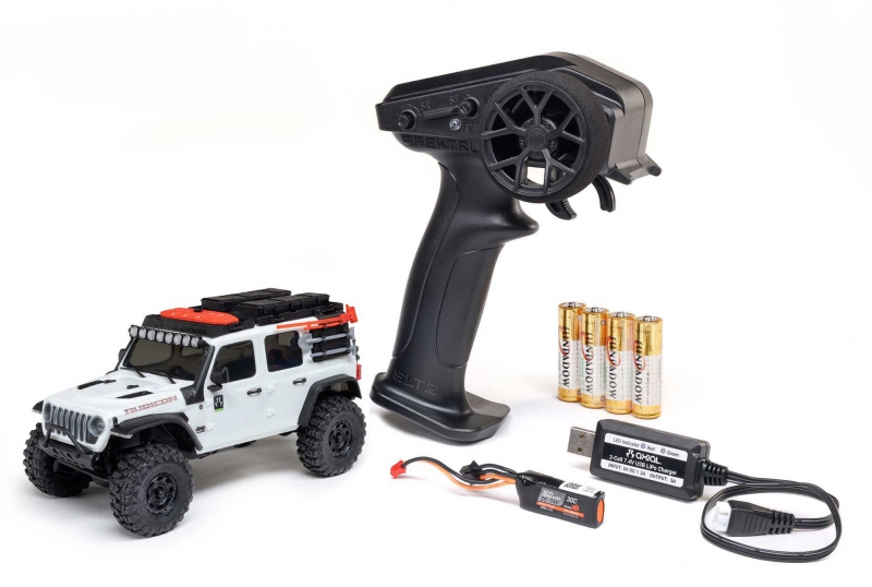 - Spektrum SLT2 2.4GHz radio, 2S LiPo battery, and USB-C charger
