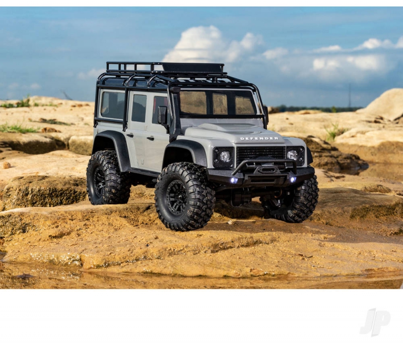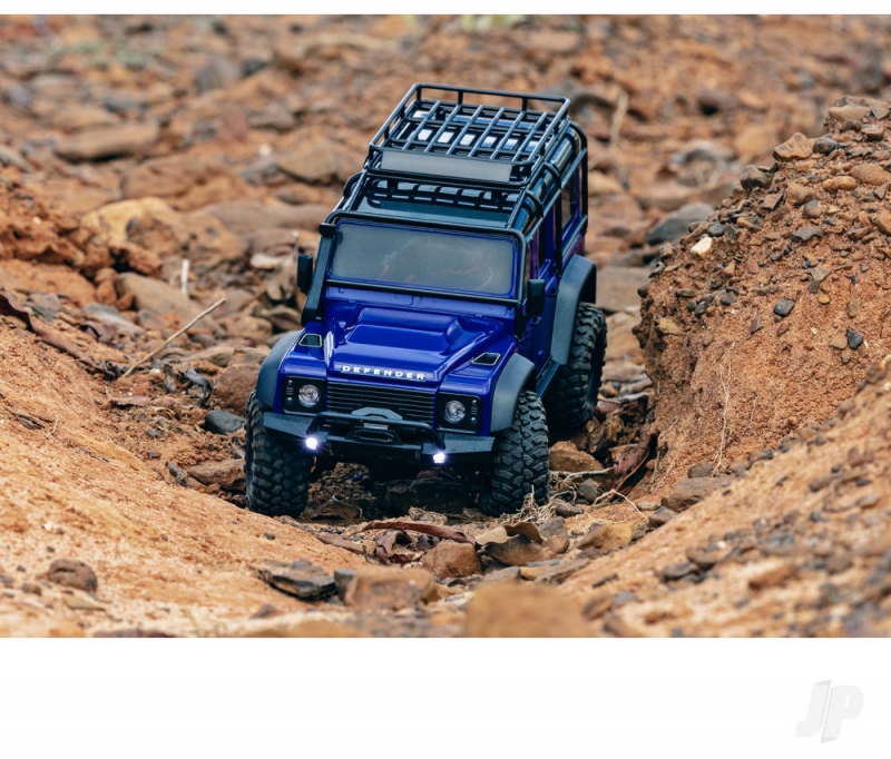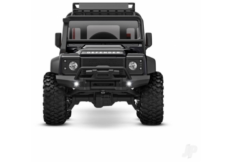 The clipless ABS body on the Traxxas TRX97054-1-BLK 1:18 Land Rover Defender crawler is designed for both convenience and authenticity. It attaches securely without clips or hook-and-loop fasteners, allowing quick access to internal components. The body features tinted windows, spare tyre carriers, and other moulded details that replicate the full-size Defender. Standard LED driving lights enhance visibility and add realism, enabling users to enjoy night-time crawling through sofa cushions or garden trails.