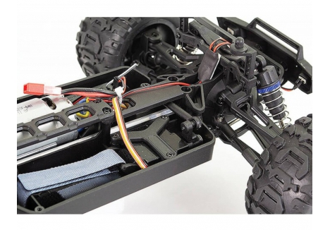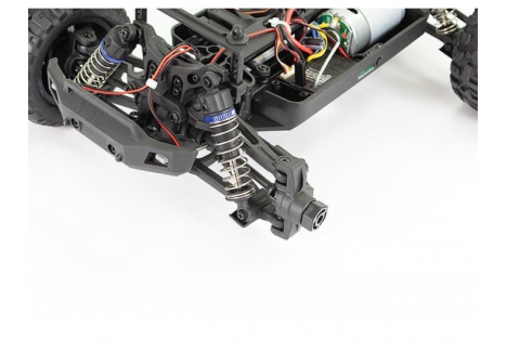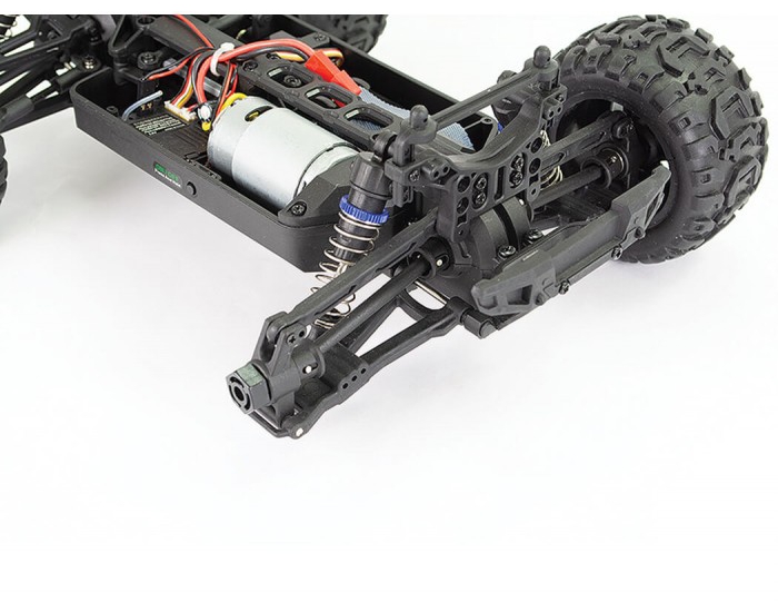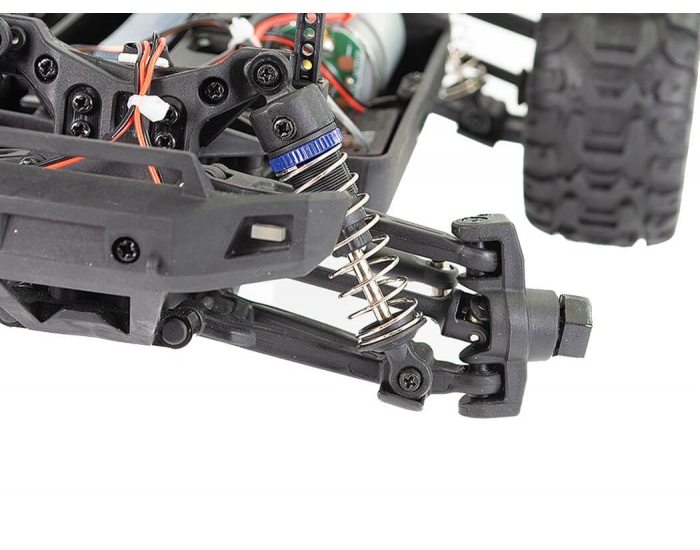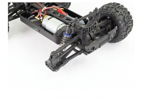 A new 100m range radio is provided to help control those longer speed runs and as with the brushed version, the Tracer brushless edition features coil sprung shock absorbers with multiple mounting points, double wishbone suspension and front universal driveshafts for smooth suspension movement while steering through the rough stuff. Shaft driven 4WD and with geared differentials front and rear provide traction in all conditions.