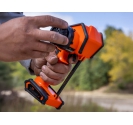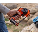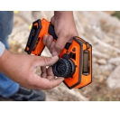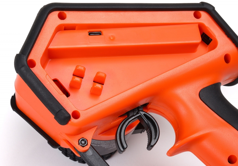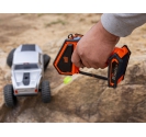 Molded Thermoplastic Polyurethane (TPU) bumpers surround the radio chassis to protect it against drops, bumps, and scrapes along the way. There's no external antenna to snag or worry about-a low-profile ridge on the chassis internally protects the robust high-speed signal output. A versatile front chassis guard enhances durability further and provides mounting options for user-integrated accessories such as a camera, light source, or anything else. The pair of lanyard mounting points allows drivers to keep the transmitter close and gain a free hand when not driving. An easy-access accessory compartment makes it possible to carry small tools, such as a T-wrench that easily snaps into the internal mount provided. We increased transmitter water-resistance* to give drivers peace of mind in rainy or wet conditions. Last but not least is an aggressive off-road style steering wheel that expands its ruggedness. It also includes an innovative thumb lever to make controlling your vehicle with one hand safer and more precise.