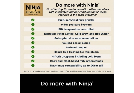 - Product Type: Ninja ES601UKBK Luxe Café Premier espresso machine, Ninja Luxe Café ES601UKBK with Dual Froth System and assisted tamper, Ninja Premier ES601UKBK coffee machine with built-in grinder and scale, Ninja ES601UKBK espresso machine with Barista Assist and 25 grind settings, Ninja ES601UKBK